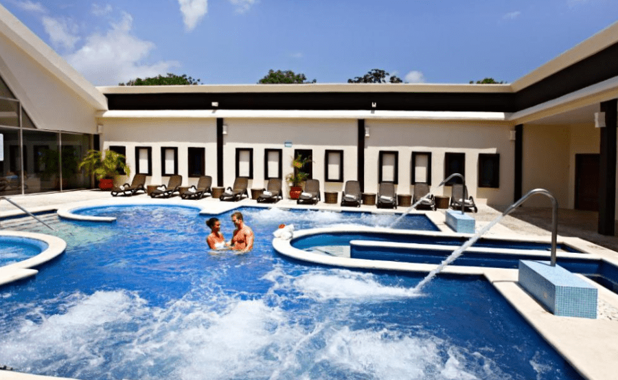 Ubicación frente al mar, Vistas espectaculares, Variedad de restaurantes, Piscinas amplias, Servicio de spa, Actividades acuáticas, Club infantil, Habitaciones cómodas, Servicio atento, y Traslado aeropuerto.