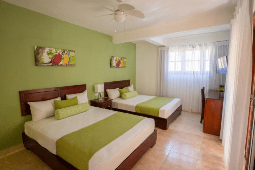 Las habitaciones y áreas comunes están decoradas con colores vivos y materiales naturales que resaltan la esencia del Caribe.